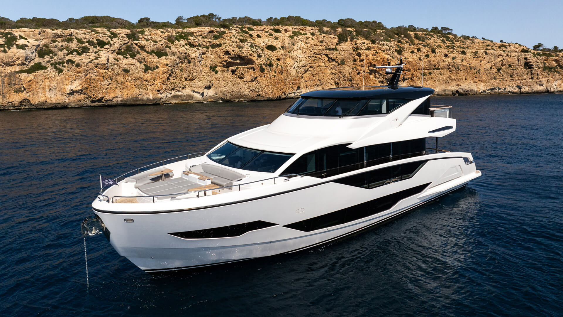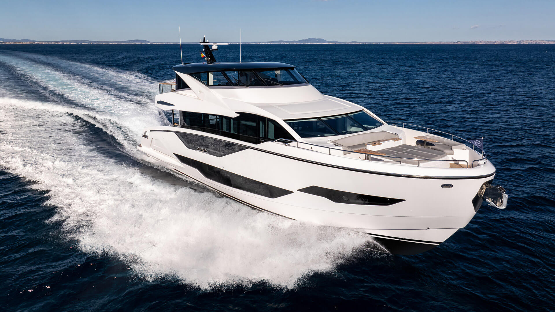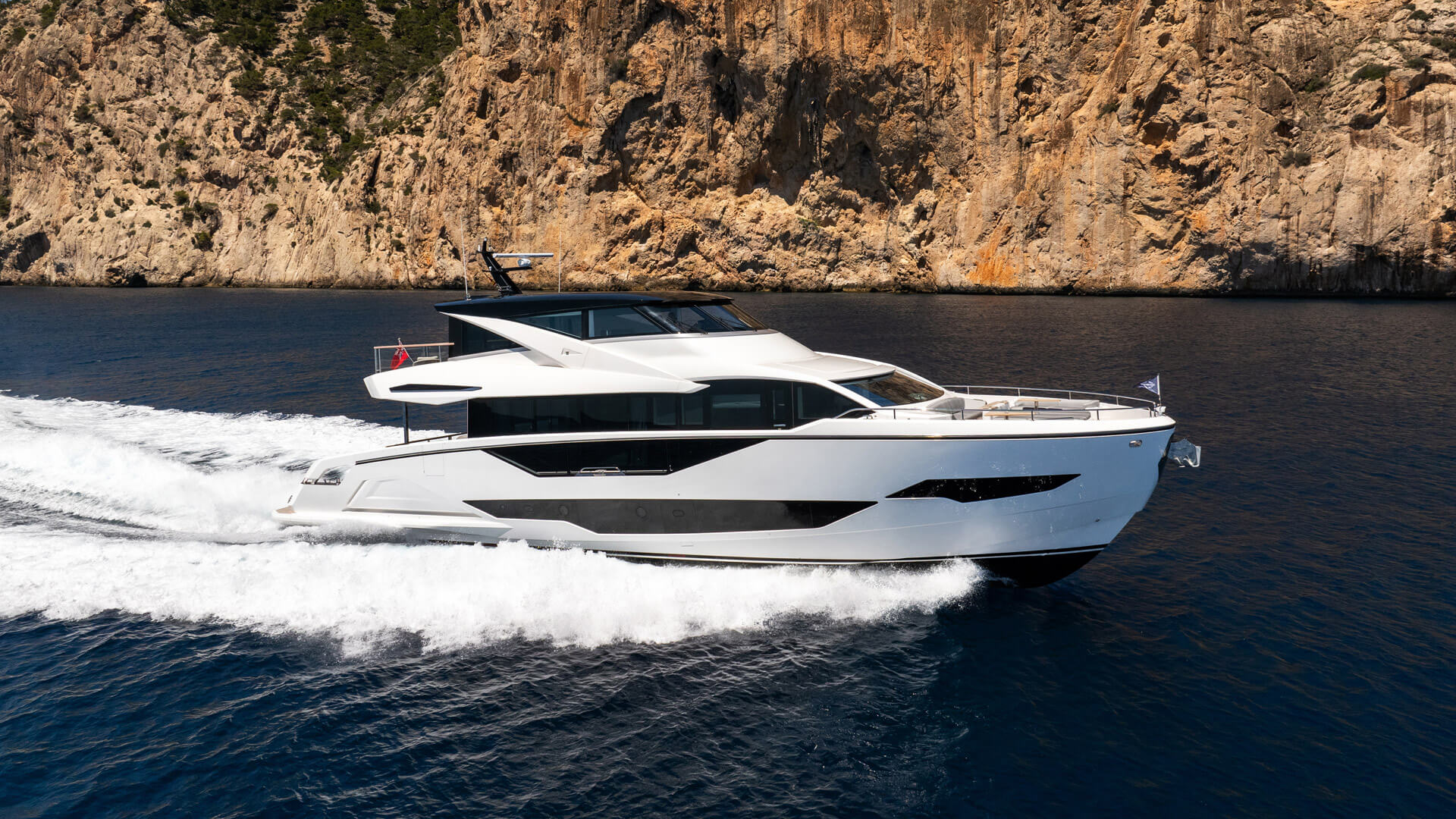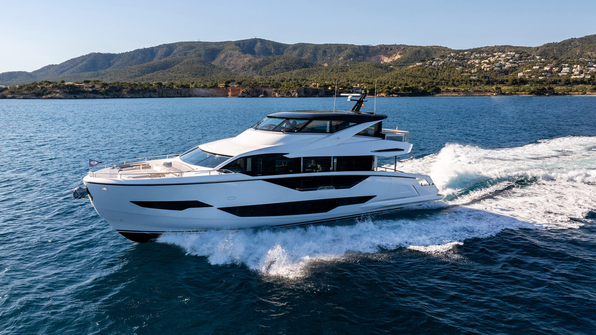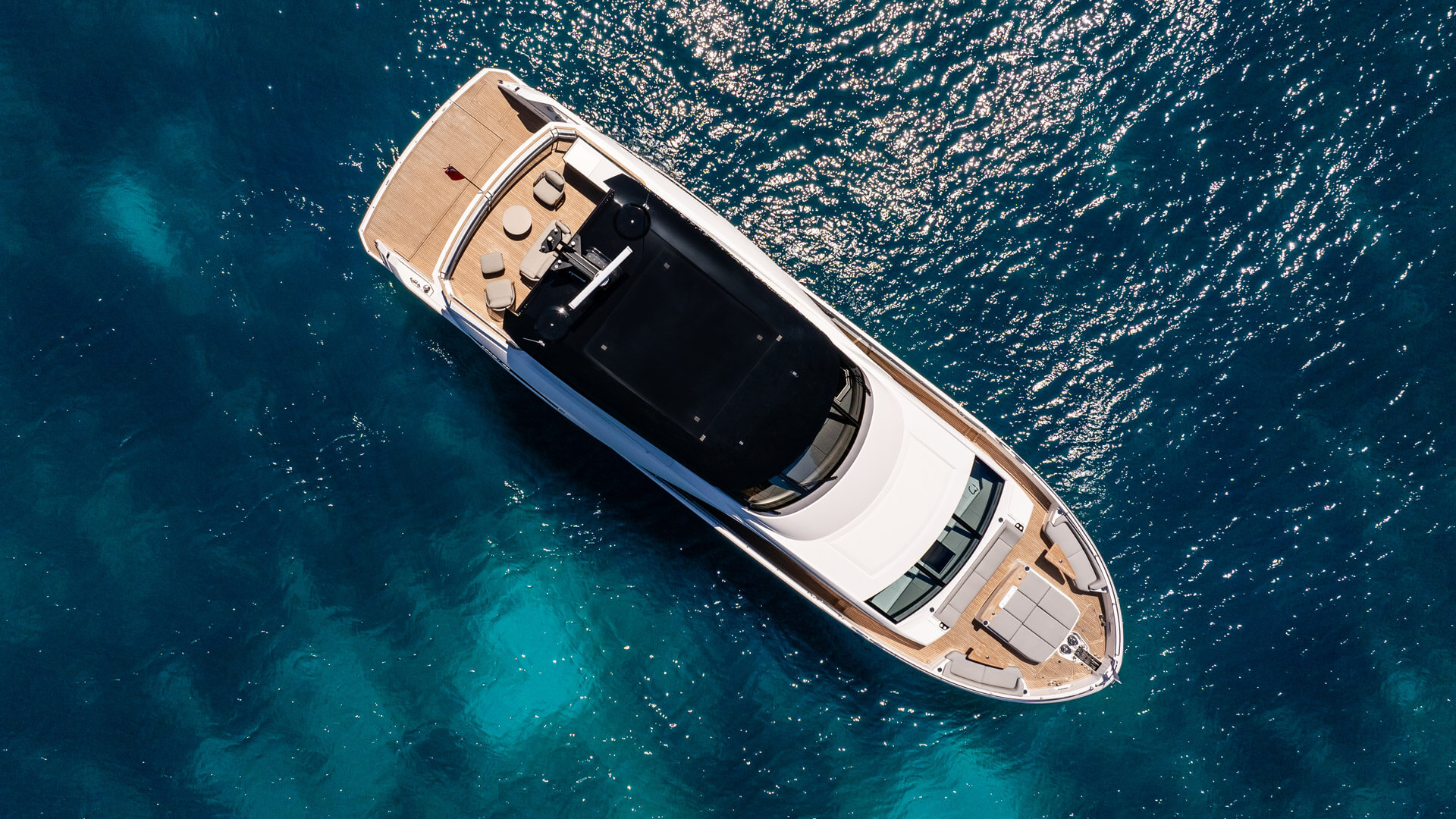 A significant interior volume transforms this yacht into something entirely new, appealing to an altogether different type of owner. An enclosed flybridge offers increased air-conditioned interior comfort, suitable for extreme hot or cold climates or for those seeking greater privacy. The helm station, typically positioned on the main deck, has moved to a single helm on the flybridge, creating a luxurious open plan main deck saloon with multiple seating arrangements, rivalling those found on-board a superyacht.